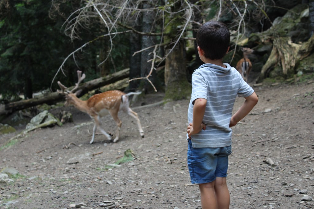 Esta excursión será la que por lo menos nosotros, los padres, no olvidaremos jamás. Fue verdaderamente mágica. Llegamos al parking a dos horas del anochecer, nos avisaron que era un poco tarde para llegar con los niños, pero no lo dudamos y empezamos a caminar las dos horas que nos harían llegar hasta el lago del que tanto habíamos oido hablar, pararíamos un momento y volveríamos a caminar hasta el coche. Para nuestra sorpresa disfrutamos más el sendero que el destino. A la vuelta empezaba a ponerse oscuro, pero todavía no necesitábamos linternas. De repente vimos a pocos metros de distancia un ciervo enorme precioso. Pensándolo después de haberlo vivido no sabemos como nos pudimos topar con un animal salvaje en libertad yendo con cuatro niños, supongo a ambas partes nos sorprendió. No nos lo esperábamos, ni imaginábamos. Fue un regalo.